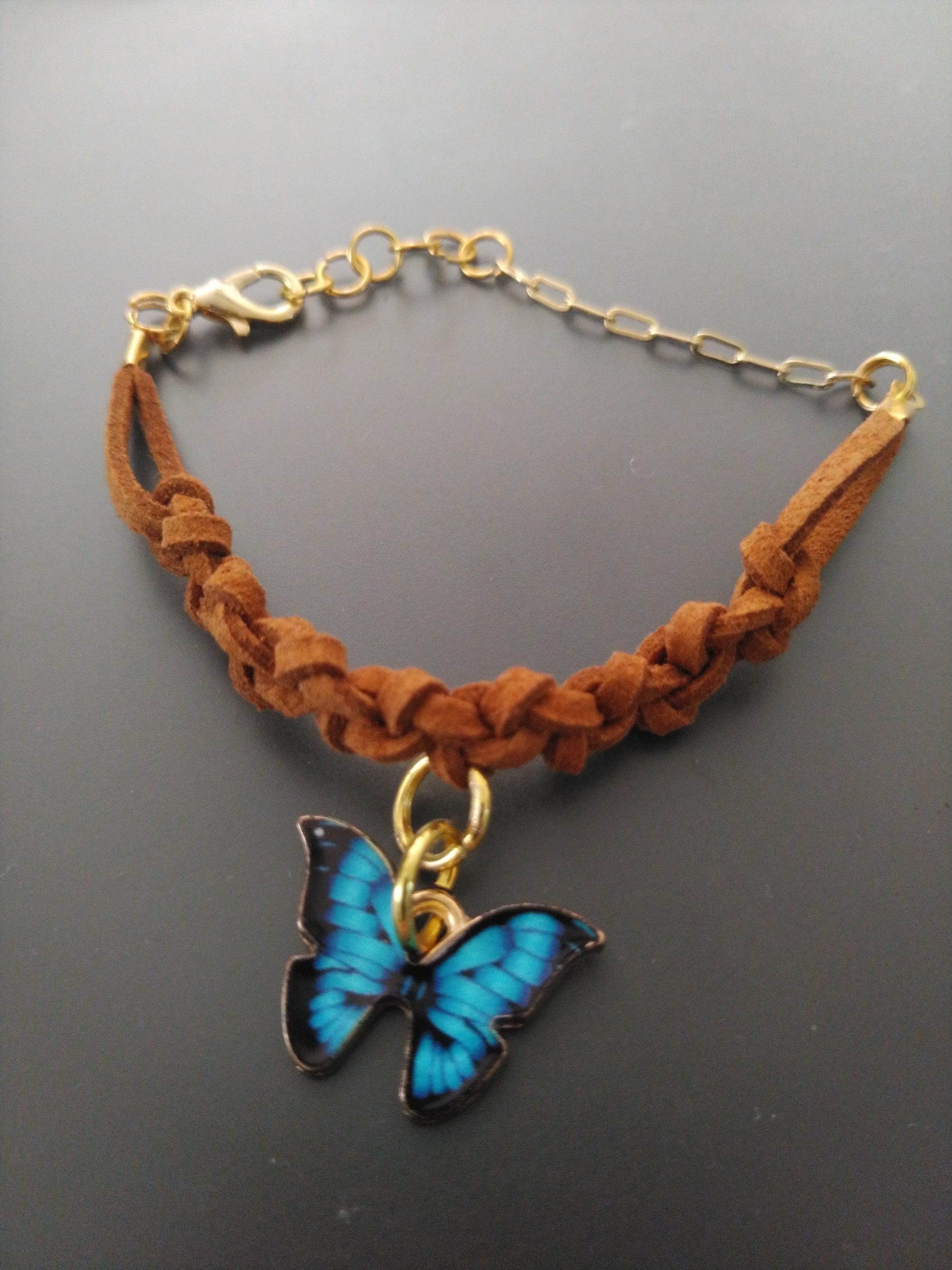 ブラウン革紐 二本編み 青の蝶のブレスレット