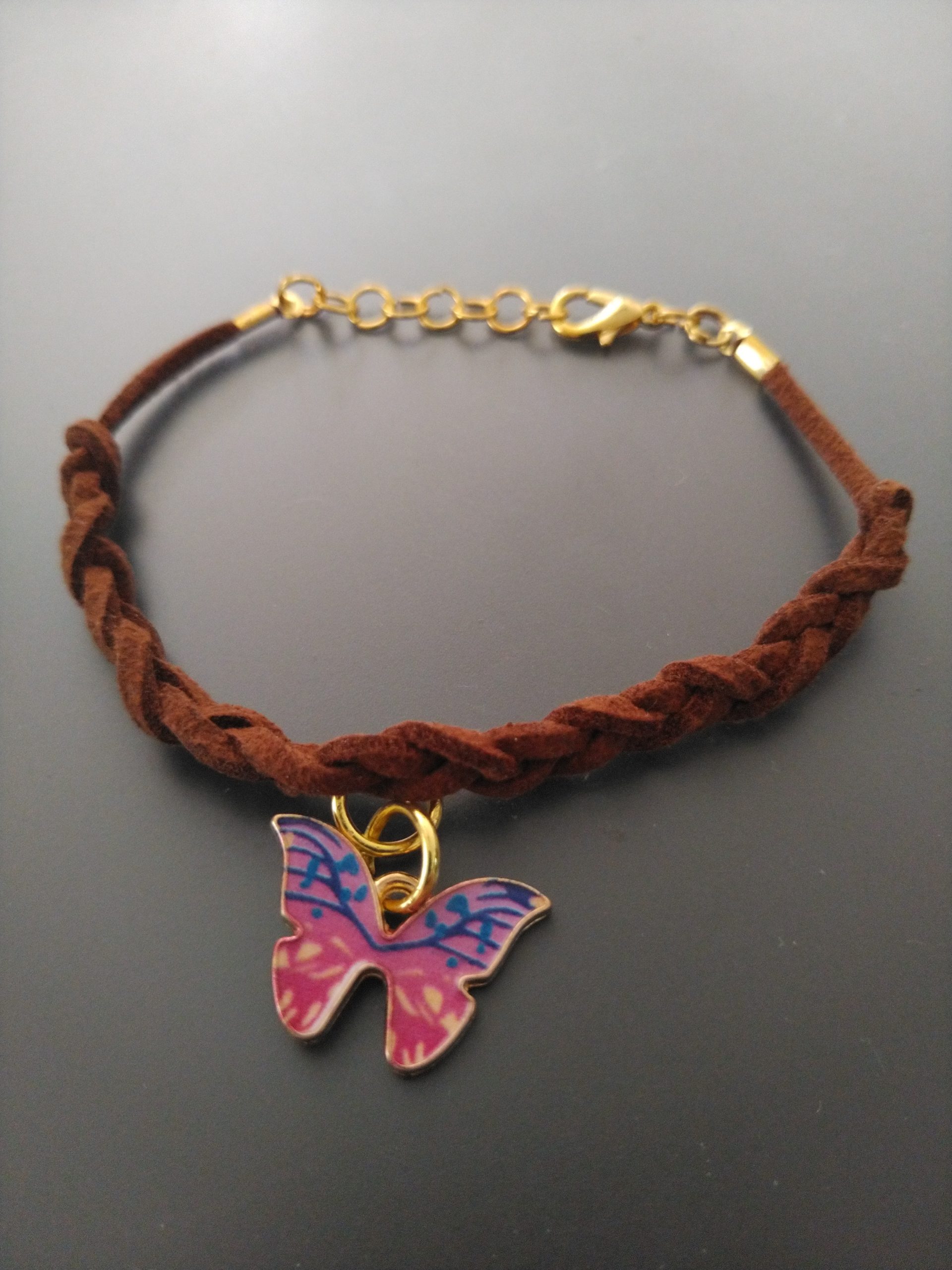 ブレスレットブラウン一本編みピンクと青の蝶々
